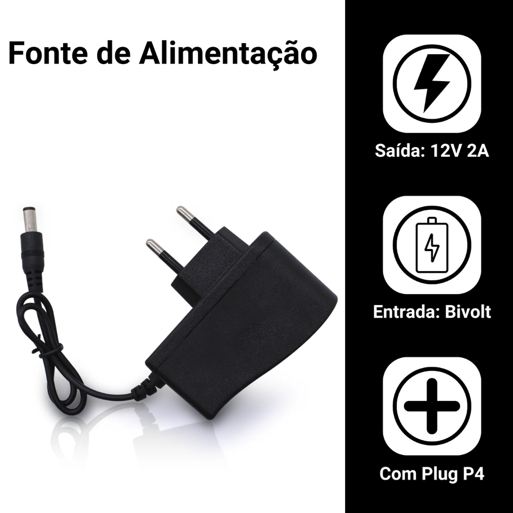 O que é este produto?Trata-se de uma fonte de alimentação, com potência de 24W, que fornece 12V e 2A na saída. Ela é bivolt, ou seja, pode ser ligada tanto em 110V quanto em 220V, sem necessidade de ajuste manual.